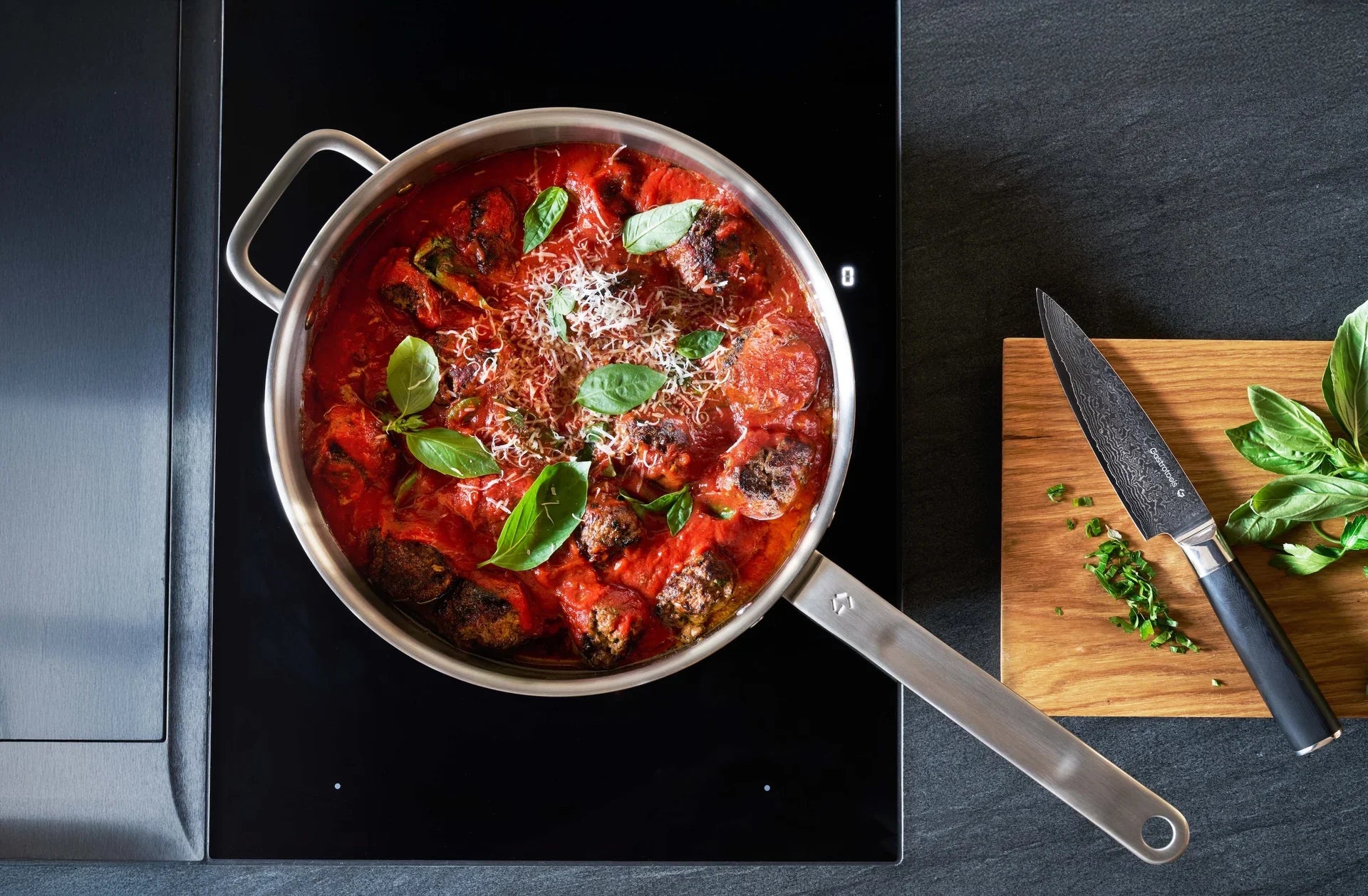 With a sauté pan you can cook everything from creamy risottos and juicy meat dishes to delicious pan sauces and deep-fried delicacies. The even heat distribution makes it ideal for simmering dishes, while the high edges make it easy to handle dishes with sauce or liquid.