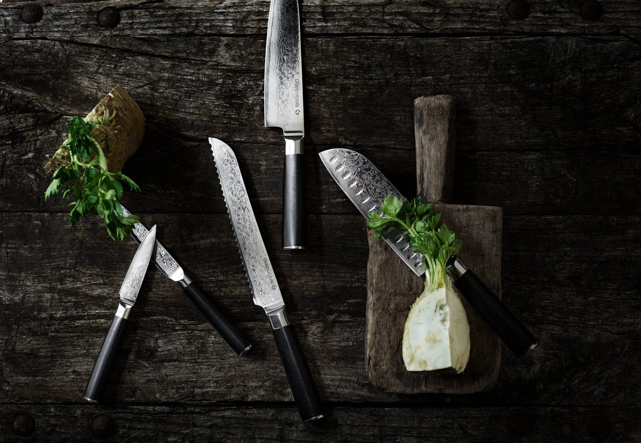 • Includes a Gyuto chef's knife, Santoku chef's knife, bread knife, paring knife, and utility knife