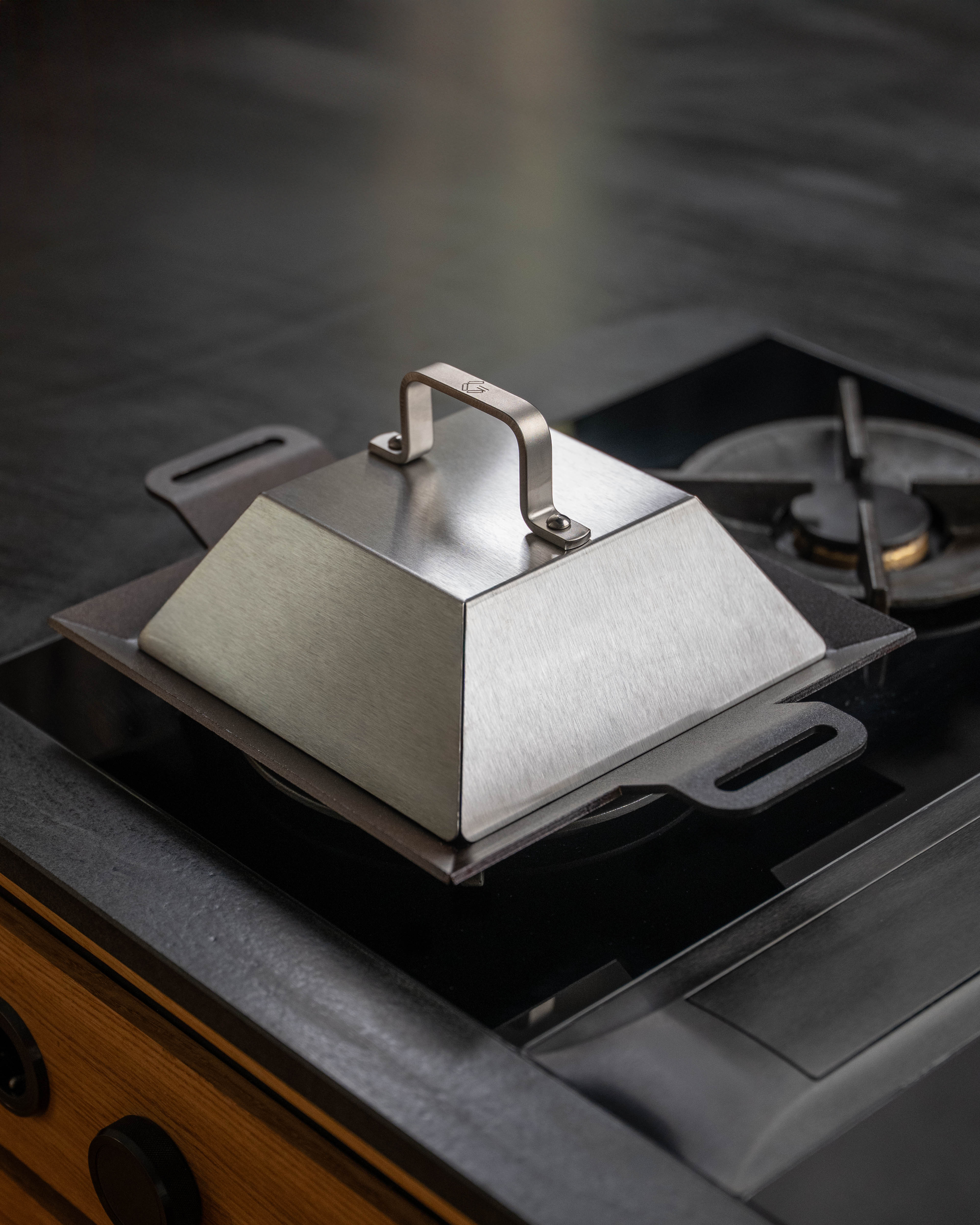 Unlike a grooved grill pan, you get maximum cooking surface, and with the smasher you increase the contact between your ingredients and the plate, so you get perfect results, whether you're making perfectly flat bacon or toast. It's simple to use: set up the fire stand and griddle, light your fire, cook your food directly on the griddle and put the lid on when you want to melt the cheese on your burgers.
