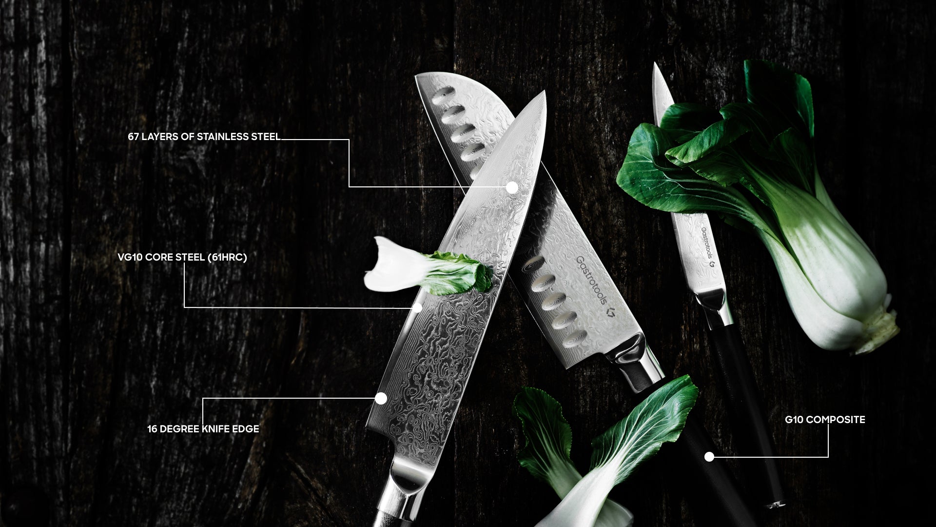Our kitchen knives are a celebration of advanced technology and traditional craftsmanship. The unique composition of VG10 steel ensures a blade hardness of an impressive 61 HRC, surpassing standard kitchen knives significantly. This not only means long-lasting sharpness but also a reliability you can count on every day, year after year.