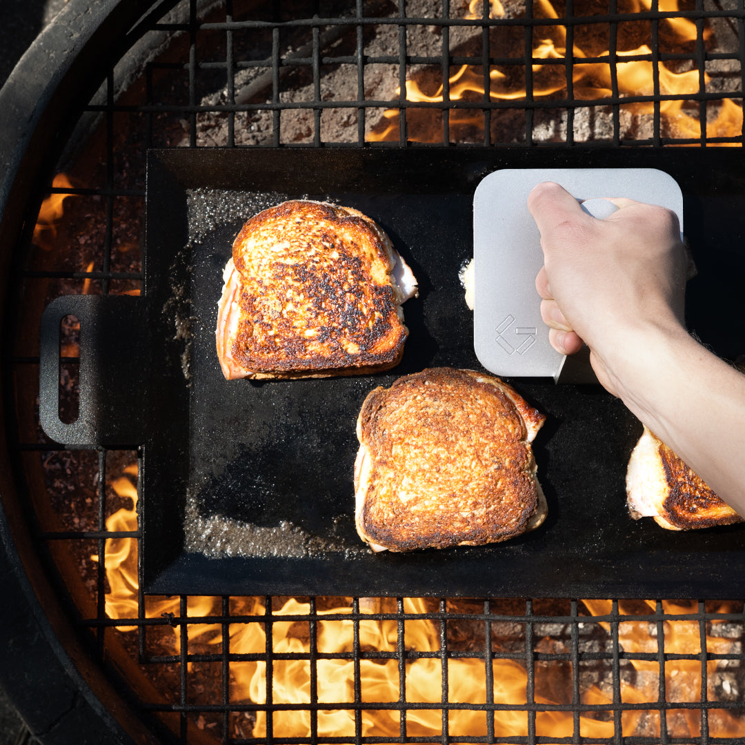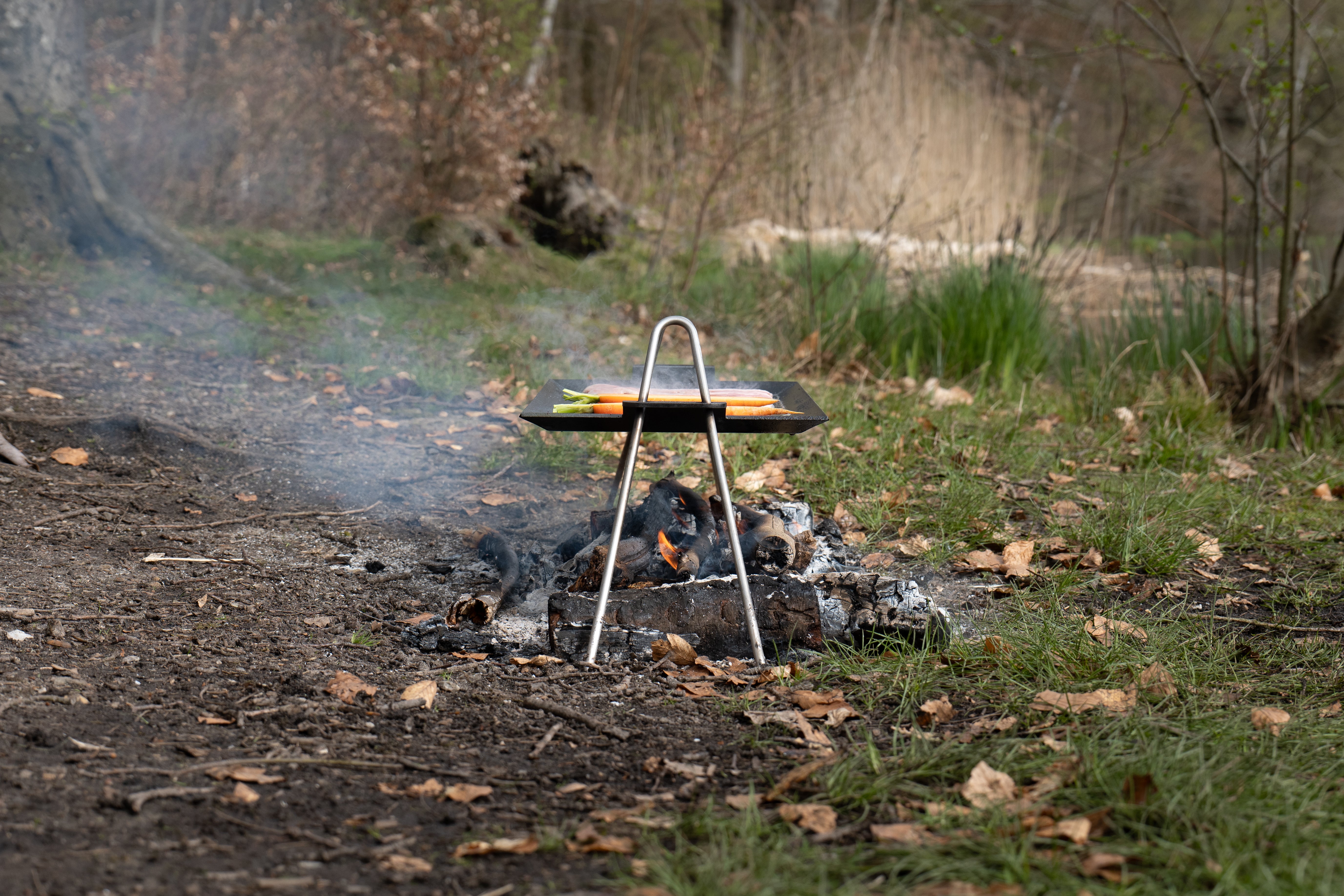 Unlike a ridged grill pan, you get maximum cooking surface - and with the smasher, you increase the contact between your ingredients and the plate, achieving perfect results whether you're making smash burgers, perfectly flat bacon, or toasts. It's simple to use: set up the fire stand and griddle, light your fire, and cook directly on the griddle - or use the griddle as a mobile stove for your pot.