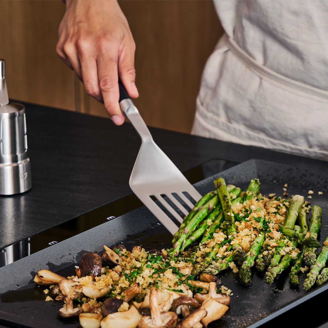 Perfect for flipping everything from sunny-side-up eggs to ribeye steaks. With its thin front edge and ergonomic silhouette, the spatula is also the perfect tool for cutting lasagna or flipping steaks on the griddle.