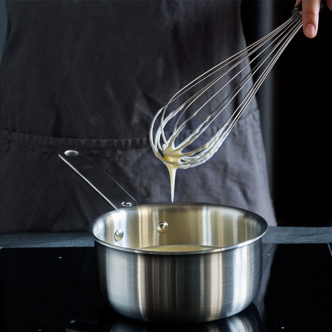 Unlike cheaper plastic or silicone whisks, our whisk is made of stainless steel with a G10 composite handle. This means you don’t have to worry about your whisk melting if you accidentally leave it in the pot—and you can look forward to the best whisking comfort, thanks to the composite handle.