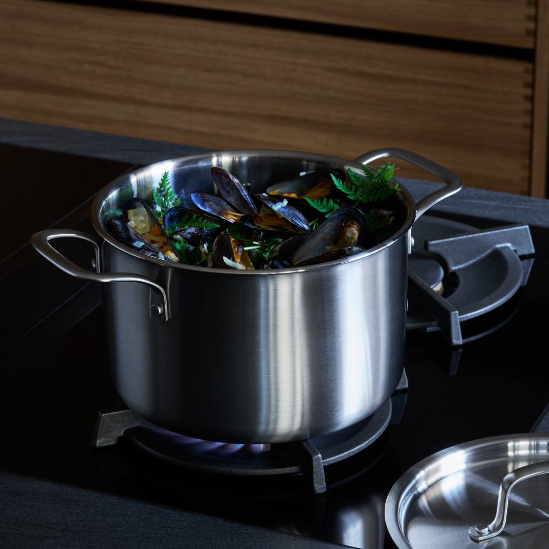 You get effective heat control thanks to the aluminium core, which has excellent heat conductivity and allows you to quickly raise or lower the temperature in the pot. Unlike cookware with an attached sandwich base, you will find that the heat spreads naturally up the sides of the pot because the entire pot is made of 5-ply – ideal for dishes such as risotto and simmering dishes. A pasta and steamer insert is the ideal upgrade for your 5-ply pot. The sturdy handles on the inserts make it easy to lower them into boiling water or a steaming pot without burning yourself, and just as easy to lift them out when the food is ready. And if you need to rinse the contents in cold water to stop cooking, you can easily lift the insert over the cold tap. Perfect for pasta, dumplings or succulent fish. All parts are handcrafted in Italy by our friends and partners Franco, Mario and Eliano, who carefully produce each product in their family workshop with over 130 years of expertise. It's Danish design, Italian craftsmanship and your guarantee of top-notch quality.