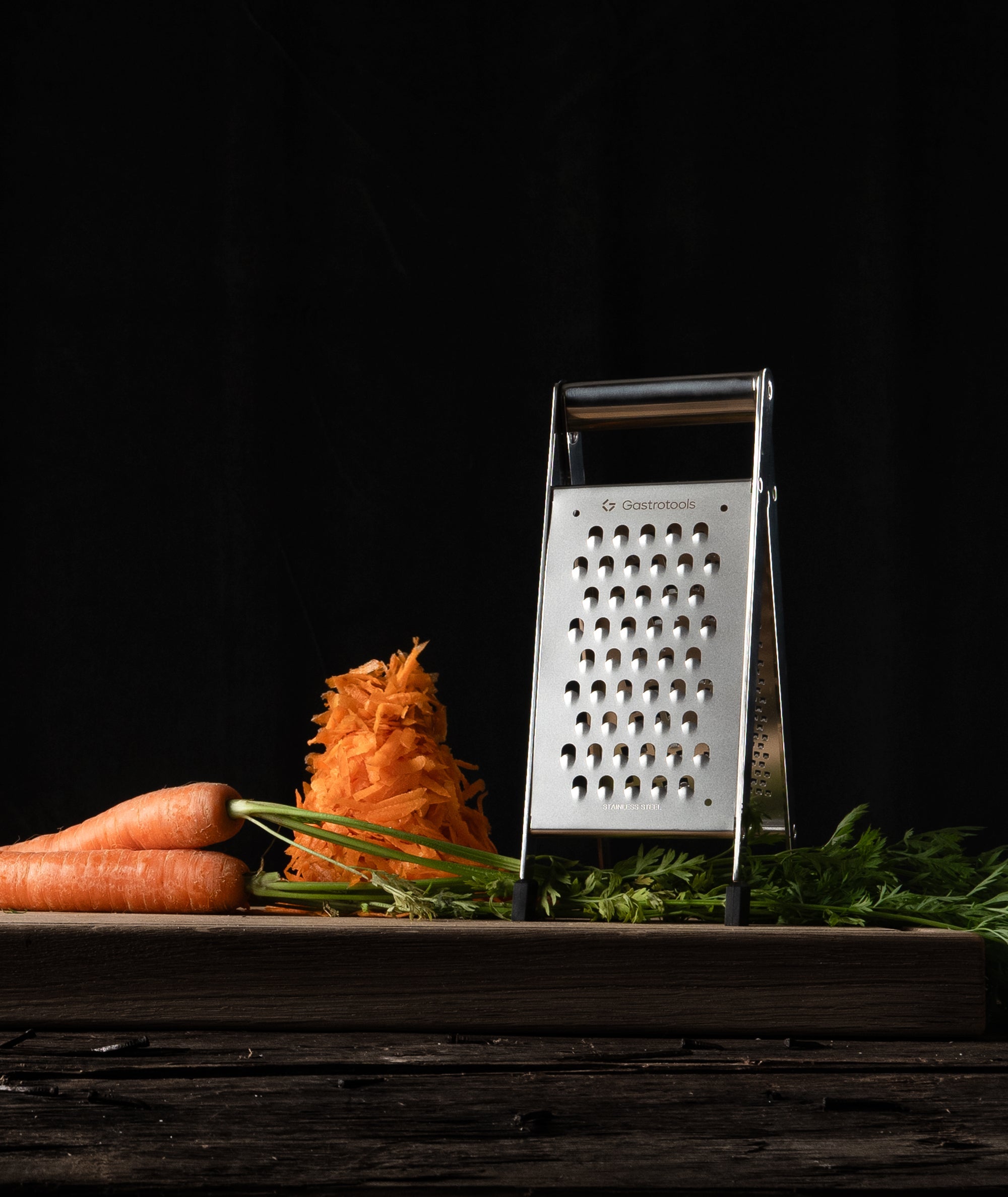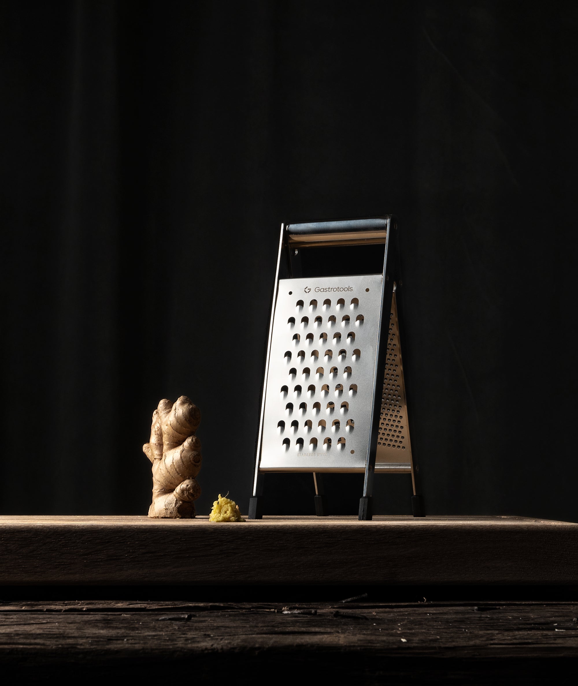 Gastrotools' ultra-sharp foldable grater in stainless steel features 3 grating surfaces: fine, medium, and coarse. The A-frame design allows for easy and stable grating, while the rubber feet prevent it from slipping. The edges of the grater are laser-cut, making them incredibly sharp compared to traditional stamped graters.