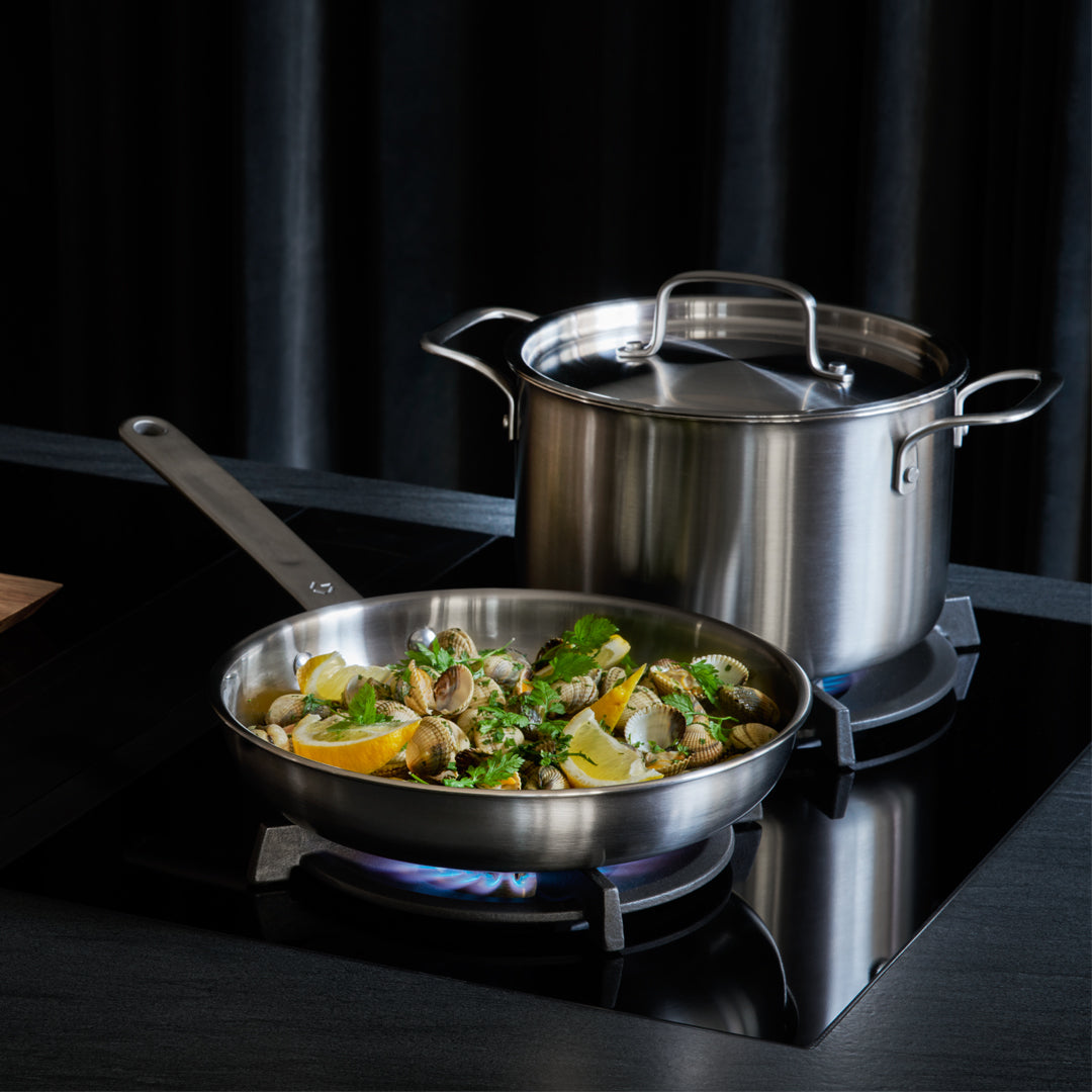 We asked Denmark’s top chefs what the ultimate series of pots and pans should look like, and here it is. Featuring professional details such as a pouring rim, CoolGrip handles, and materials used in the world’s finest restaurants. This set is the complete 5-ply collection, perfect for anyone looking to replace their cookware – for the last time.