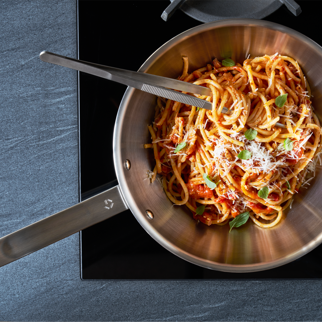 We asked Denmark's top chefs what the ultimate range of pots and pans should look like, and here it is. Featuring professional details such as a pouring rim, CoolGrip handle, and materials used in the world’s finest restaurants. The wok’s flat base makes it perfect for home kitchens – whether you’re making stir-fry, fried rice, or tossing a pasta dish along its curved sides.